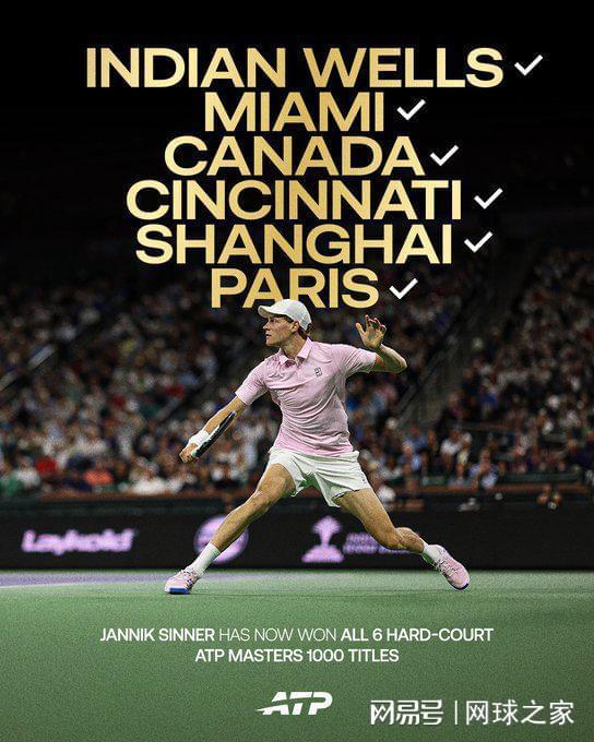 此前,辛纳已经在罗杰斯杯、迈阿密、辛辛那提、上海和巴黎的五站硬地大师赛夺得冠军,今天在印第安维尔斯夺冠之后,辛纳达成了全部六站硬地大师赛冠军的纪录。